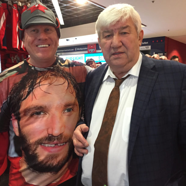 Friend of the blog Charlie McManus, aka Caps Shirt Guy, unveiled a new Ovi shirt at Sunday’s “Celebrate Ovi Day.” He also had the pleasure of meeting Alex Ovechkin’s father, Mikhail Ovechkin.