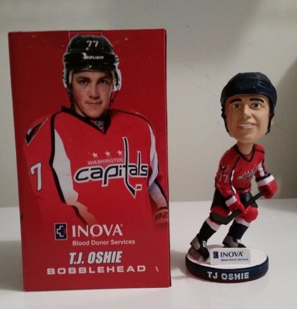 The Capitals released their 2017-18 promotional calendar on Tuesday, and the first thing we looked for, of course, was the bobblehead. T.J Oshie will be getting his first stadium giveaway bobble, on March 20 vs. the Dallas Stars. This will, however, be the third Oshie Caps bobblehead made as he enters his third year with the team (see photos of the others below).