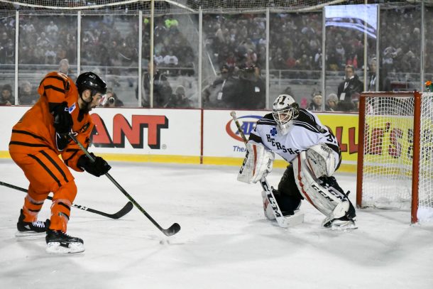 The Hershey Bears decided to finally take control of the game.  Quick plays along with tough hits.  Alex Lyon (goaltender of the Phantoms) turned everything away.  Other than the first goal he allowed, Lyon was stellar.  His rebound control was incredible, especially for the conditions of playing outside.