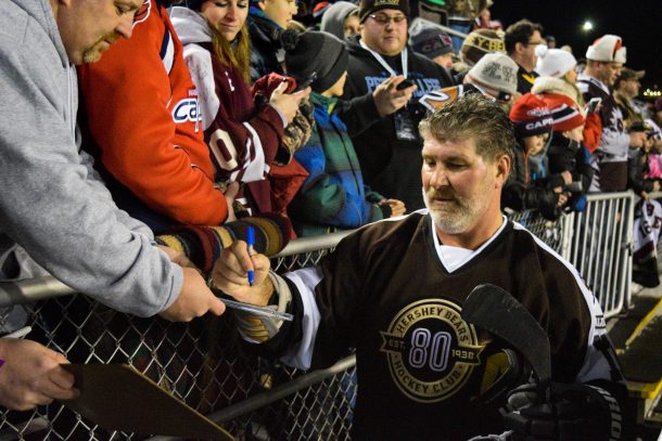 In a remarkably different feel, the Hershey Bears Alumni (including Ray Bourque) creamed the Philadelphia Flyers Alumni 9-5 the night before. Graham Mink electrified the crowd with two goals, and a fight broke out in the latter stages between Dennis Bonvie and Riley Cote.