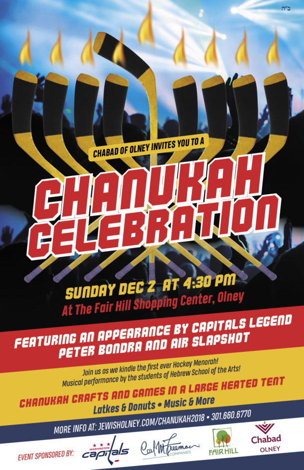 The Chabad synagogue in Olney, Md. built a menorah out of hockey sticks to celebrate the Caps’ Stanley Cup victory. On Sunday, Peter Bondra will be there, at the Fair Hill shopping center at 4:30 p.m. to light the first candle.