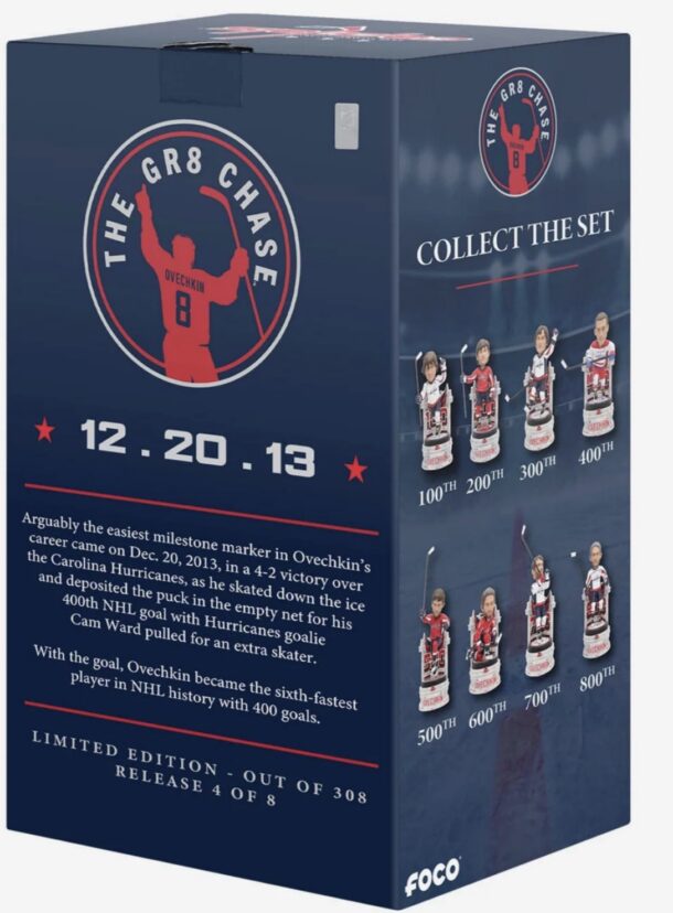 As we announced a few weeks ago, our friends at FOCO are releasing a special bobblehead of Capitals captain Alex Ovechkin for each of his 100 goal milestones. This week, we’re on goal 400, which he got on Dec. 20, 2013.
