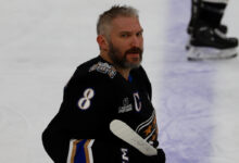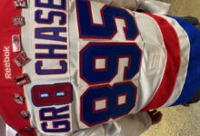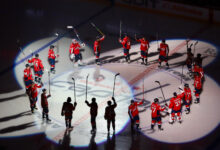 This bobblehead portrays Ovechkin wearing a suit and team cap while holding his new team jersey, ready to kick off his career. The team colored backdrop with team logo displays and crossed hockey stick accents to celebrate one of the most exciting nights on the NHL calendar.