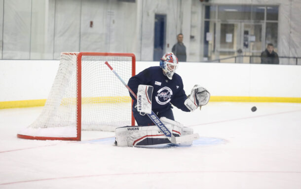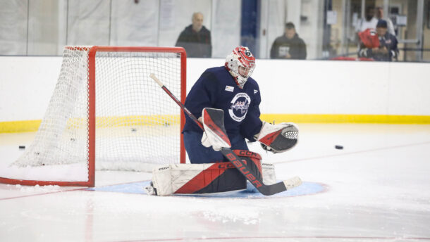 Seth Eisele, who signed an ECHL contract with South Carolina for the 2024-25 season, sets up the net for shooting practice at the Caps Rookie Camp.