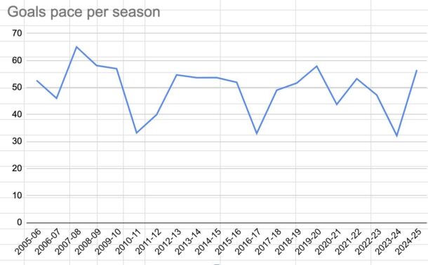 Ovi’s next two seasons were great, as he scored 50 in 2021-22, and then 42 in 2022-23, though his per-game average was 47 that season.
