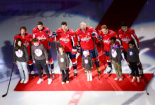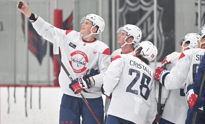 LW Ilya Protas (62) takes a selfie with his fellow prospects after a skills session at the Washington Capitals Development Camp at MedStar Capitals Iceplex in Arlington, Virginia., Friday, July 4th, 2025 (Photo/Robert Raymer)