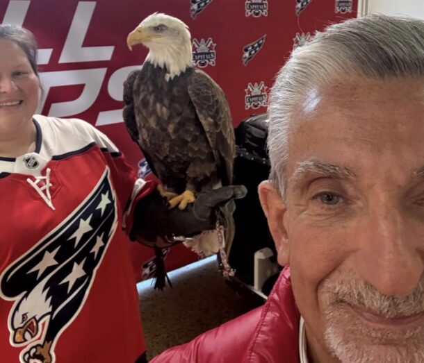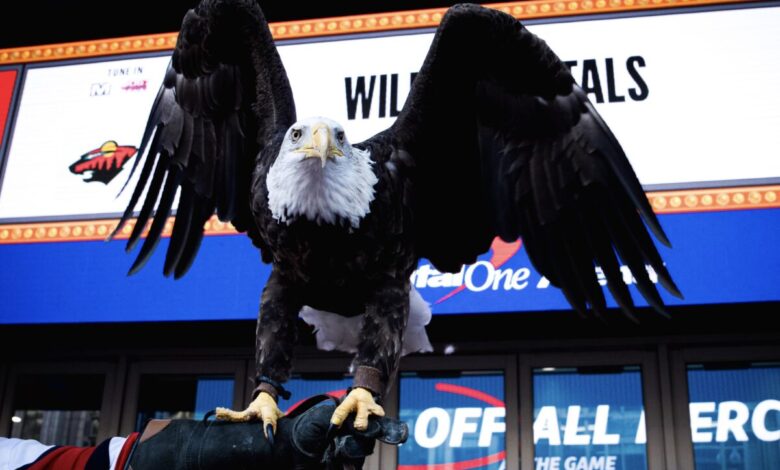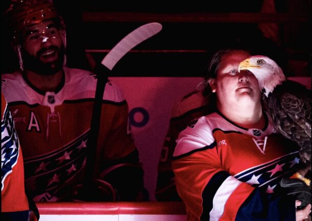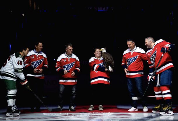 Before the Caps game against the Wild on Friday, the team brought out alumni Peter Bondra, Calle Johansson, and Olaf Kolzig for the ceremonial puck drop, along with a special guest: Penny, the eagle. The eagle came to celebrate the team wearing their new ‘screagle’ jerseys.