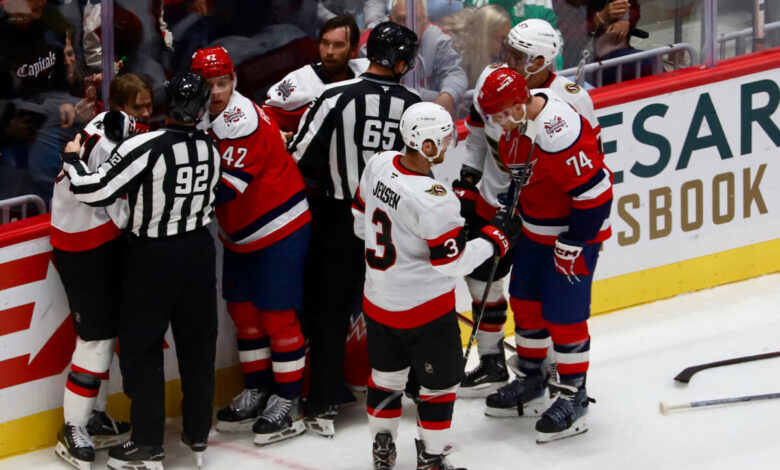 With the Caps down 4-0 to the Senators on Saturday, goalie Charlie Lindgren had it. Near the end of the second period after a shot and a whistle, he left his crease and got into a scrum, making Ottawa goaltender Linus Ullmark leave his crease, cross the red line and toss his glove, but the refs prevented the goalie fight. However, they both got leaving the crease penalties, while Ottawa’s Ridly Greig took a two-minute roughing penalty and Martin Fehérváry took a double minor.