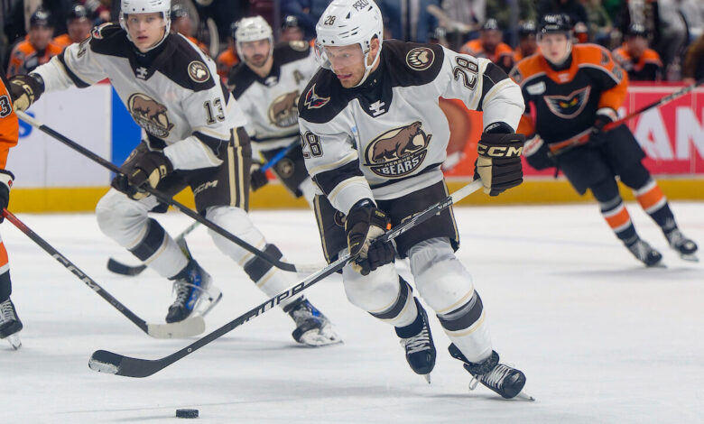 HERSHEY, PA – OCTOBER 25: Right Wing Luke Toporowski (22) of the Hershey Bears collects the puck during overtime of the AHL hockey game between the Lehigh Valley Phantoms and the Hershey Bears on October 25, 2025 at the Giant Center in Hershey, PA. (Photo: Robert Raymer)