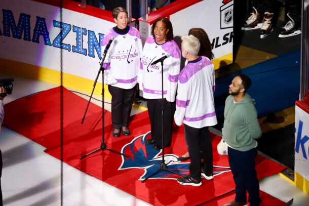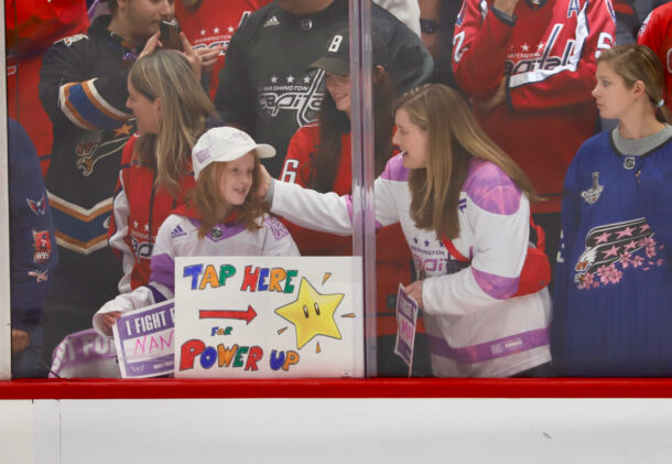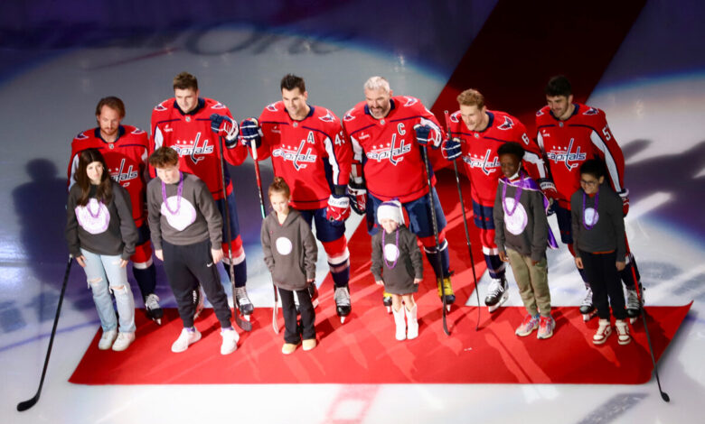 It was Hockey Fights Cancer night at Capital One Arena on Saturday, and the Caps took pre-game warmups with many of them sporting purple (the charity’s color) tape on their sticks. Four Caps, Alex Ovechkin, Jakob Chychrun, Rasmus Sandin and Connor McMichael, wore special hats.