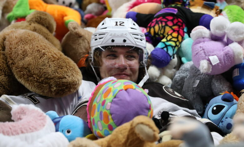 HERSHEY, PA – January 4th: Defenseman Ryan Chesley (5) of the Hershey Bears poses with a stuffed hedgehog as workers clear the ice at the 2026 Teddy Bear Toss the AHL hockey game between the Rockford Ice Hogs and the Hershey Bears on January 4, 2026 at the Giant Center in Hershey, PA. (Photo: Robert Raymer)