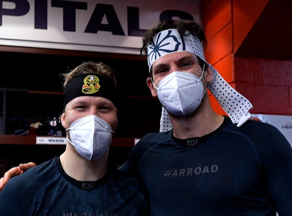 The white headband is from Miyagi-Do, which stresses defense, while the black headband is from the Cobra Kai Dojo, which stresses offense. The winners after each game are selected by the previous winners. The Caps don’t always announce the winners after each game but we’ll do our best to keep this up to date. Click on the image for a larger version.